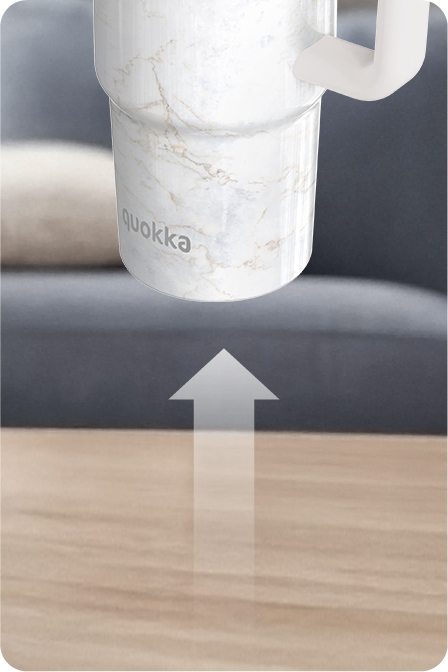 Para beber de un producto Drop Safe, simplemente levántalo verticalmente y la base se separará de la superficie en la que esté apoyada. Así de sencillo